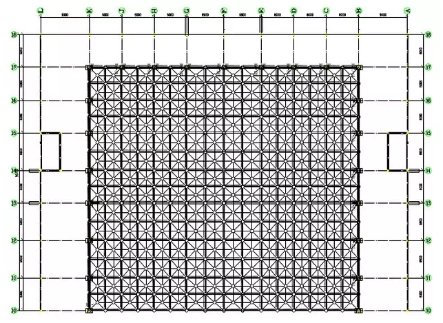 本方案包括1#大棚、2#大棚和3#大棚三部分,本节中以1#大棚为例做详细说明。1#大棚结构工程分为2-9/B-K和10-17/B-K两部分,根据实际现场特点,网架面积大、高度高。我施工人员把网架安装初步定为地面拼装,整体吊装的安装方法,该方法我公司已经在多个工程使用,实践证明该方法有如下优点: