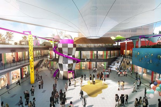这个露天购物中心是围绕着一个糖果厂的主题设计的,它的色彩鲜艳,意在暗示里面的娱乐活动。