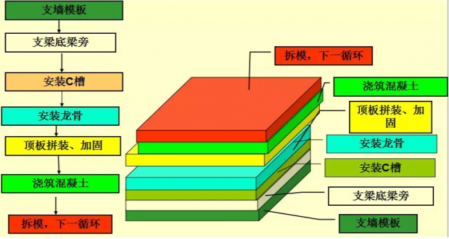 支墙模板→支梁底梁旁→安装C槽→安装龙骨→顶板拼装→加固→浇筑混凝土→拆模、下一循环