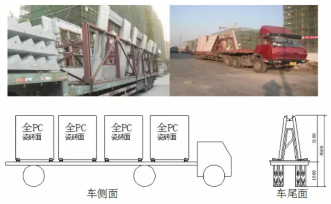 1.PC结构应考虑垂直运输,因为这样既可以避免不必要的损坏,同时又避免了后期的施工难度,装车前先安装吊装架,将PC结构放置在吊装架子上,然后将PC结构和架子采用软隔离固定在一起,保证PC结构在运输的过程中不出现不必要的损坏。