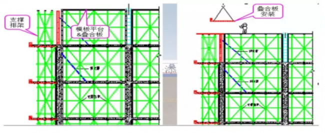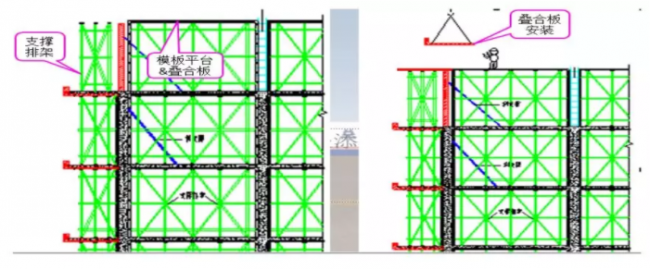 分解图四:外墙板吊装、校正完毕;根据日式配模施工流程,分别进行剪力墙、梁支模,搭设楼面模板和叠合阳台板排架等