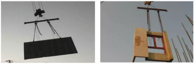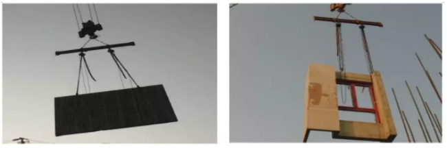 第二种吊点形式是在PC结构上边沿预埋螺栓套筒,将带有吊环的高强螺栓拧进螺栓套筒,用钢扁担将PC结构吊装到应该施工的位置。