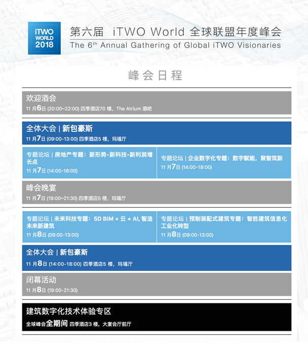 为进一步深入探讨行业痛点和剖析数字化转型的制胜点,iTWO World全球峰会特设房地产、企业数字化、未来科技和预制装配式四个专题分论坛,围绕以下热点话题展开交流:全球数字化实践、建筑行业人工智能、垂直云、托管服务、智能生产、预制装配式建筑、智慧城市、智能供应链、物联网、虚拟现实、大数据、人才教育、数据安全等。