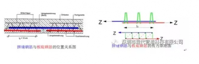 2、拼缝两侧板厚范围内布置桁架钢筋,拼缝钢筋穿过第一排桁架的长度满足一定要求,可以使拼缝钢筋与受力钢筋实现间接搭接传递拉应力。