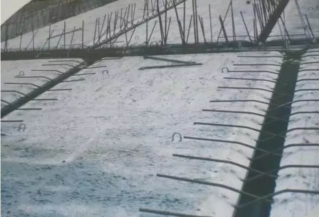 如果施工过程中在板底进行观察,可以发现裂纹的渗水逐渐成浑浊的乳白色,甚至出现水泥的灰色,在混凝土初凝后才基本停止渗漏,此时混凝土浆液开始在裂纹中不断结晶硬化,填补了所有的空隙,使得裂纹自行愈合。