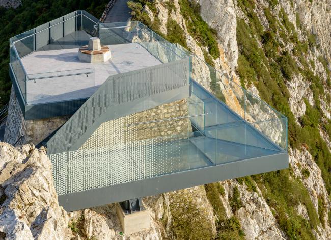 由于这个区域的垂直通道仅限于非常狭窄和蜿蜒的道路,因此整个人行道结构必须以较小的部分制造,这些部分可以在原地运输和组装——这是在天气条件变幻无常地区给出的相当大的挑战。陡峭的悬崖下面。该组件进一步受到可以使用的起重机的最大尺寸的限制,因为这需要根据其所在的旧军用平台来确定尺度。主要钢结构由18个独立的部件构成,总重量超过30,000千克。玻璃模块总面积超过750平方米(大致相当于4个网球场的面积),最大的部件重约650公斤。
