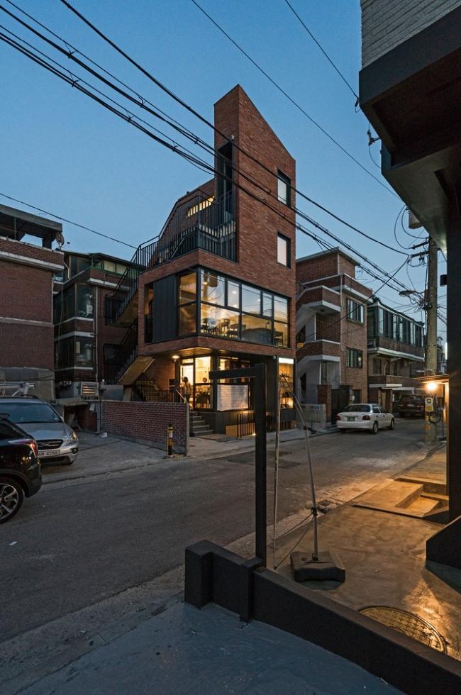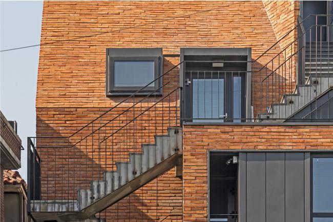 芒原洞地区通常都是红砖别墅。我们和客户都希望保留这个社区的氛围,所以决定使用再生砖瓦。我们想要创造一个坚实粗糙的、纹理错综的建筑,打破竖向的严整纹理,而楼梯的空隙则使用金属覆盖。通过轮廓、角度和材料的结合,该建筑的活力变得可观可感。