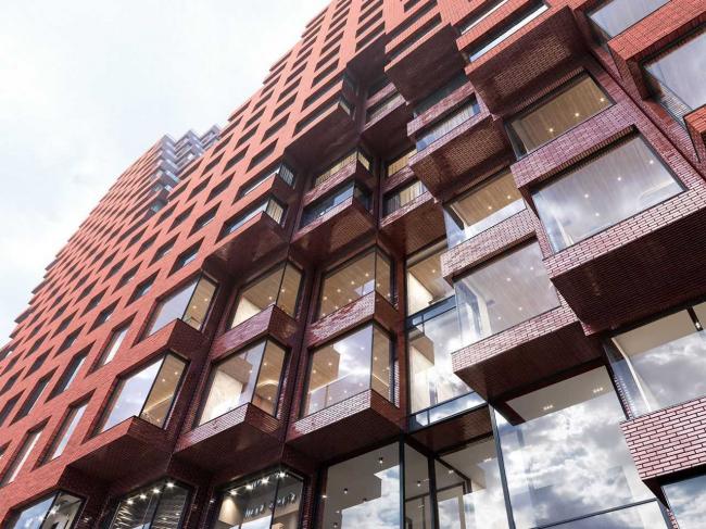 立面上的开窗根据不同房间的位置而设定了不同的大小,进而形成了外部造型的纹理感。立面上采用的红色瓷砖根据窗扇的尺寸做成渐变形式,与整个建筑体量形成对话关系。公寓楼(BIM教程)上的独特红色不仅借鉴了周围的构建注意建筑形式,还为整个建筑奠定了温暖、温馨的生活氛围。室内空间的设计由两家荷兰设计公司Sabine Marcelis和i29 interior architects以及一家俄罗斯事务所Oleg Klodt 设计完成。