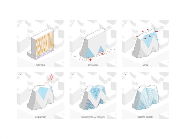 289套公寓中面积从27到253平方米都有,都可以享受到住宅内的配套设施,比如占据两层楼的并且带有游泳池的健身中心、带有露天躺椅的大型室外露台、供儿童使用的游戏室、合作空间、可租用的派对空间、影剧院、购物中心、超市以及最多可以停放284辆车的停车场。此外,方案中使用的模块化系统能让建筑拥有更加灵活多变的外部造型和室内套型,在同一座公寓中兼备紧凑型套型和大面积套型。建筑体量具有极强的雕塑感和变化性,为创建独特的入口空间创造了良好的条件,另外其缓坡式的屋顶设计也进一步强化了朝向城市的景观视野。立面顶部和底部的切割依据有两点,其一是更具内部功能的使用需求,另一个则是要在室内空间营造的某种品质(BIM工作)。