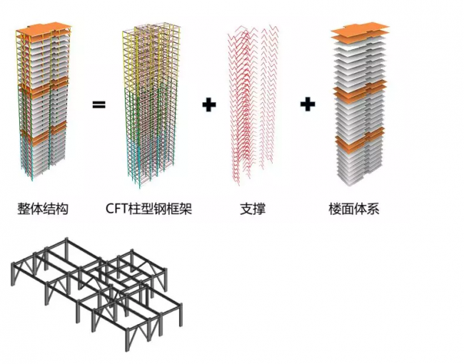 结构体系为钢管混凝土柱钢框架+钢支撑,具有以下特点: