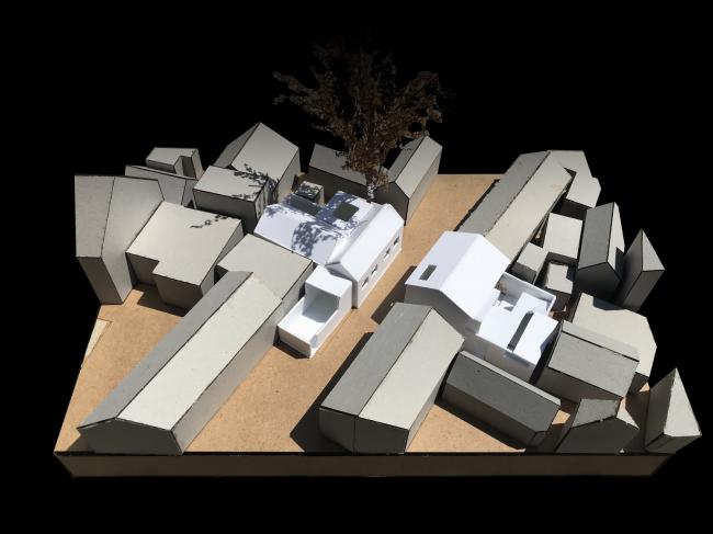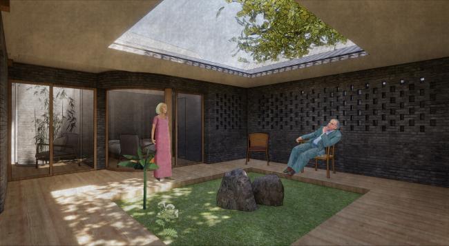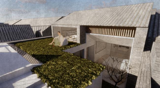 因场地紧邻两栋较高的三层建筑,对于合院的压迫感极为严重。所以我们尽可能通过视线上的引导与遮挡来解决场地问题。