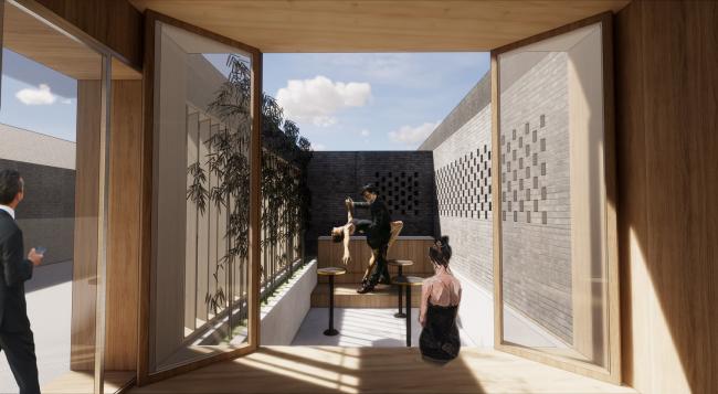 而7号恰好沿街坐落在羊房胡同,其古建筑旁延伸出来一个平屋顶的现代加建,我们顺势将其设计成了一个现代的沿街景观。它与内向型庭院遥相呼应,这是传统与现代的完美结合,“双合”由此产生。