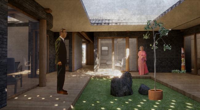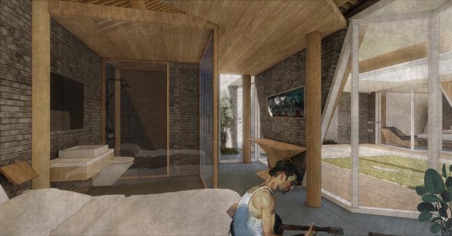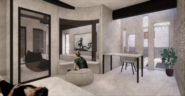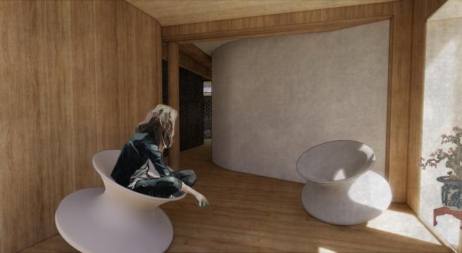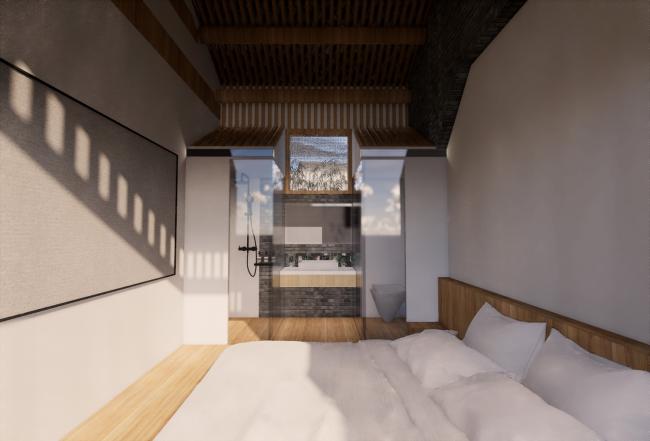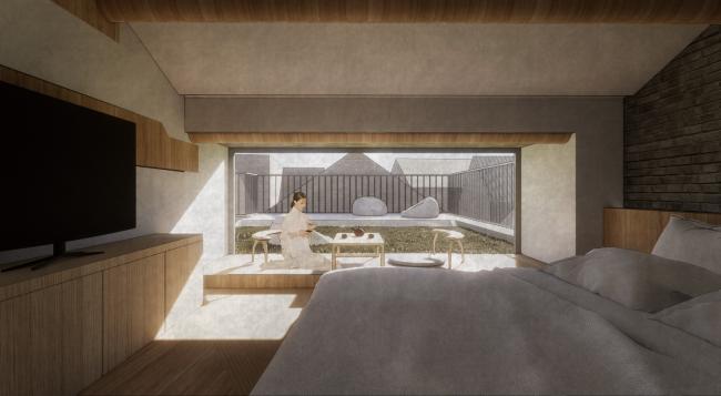 围绕着院子我们将其分为了四间客房,为了保证更好的流动性,每间客房仍以弧形墙形式构成,这也象征着内部与外部世界的紧密相连,它应该就像个无形的宇宙连接着人与自然、大地与苍穹、传统与未来。