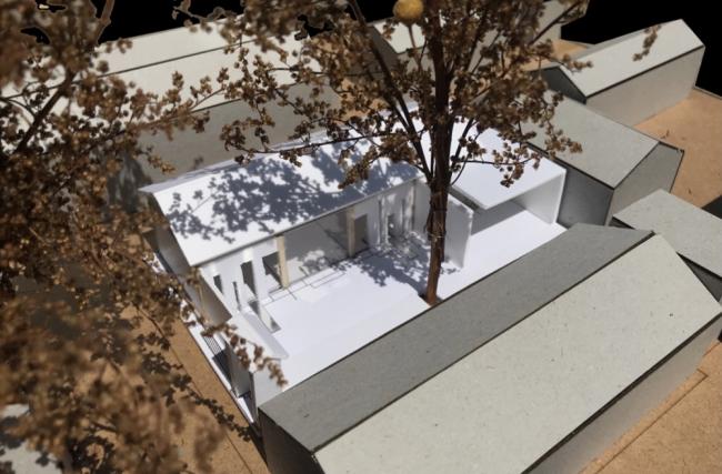 其场地特点在原建筑周围环绕着三颗国槐皆为二级保护古树,即便晴天场地也层层遮盖在大树的阴影下。我们利用其特点试图将斑驳的树影作为设计灵感的主要源泉。“影”也就成为了贯串始终的一个主要元素植入。