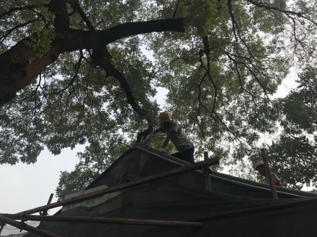 这里透过庭院的中央看到的是一棵苍天古树,人工与自然的关系和谐共处。树下也就成为了一个公共纳凉的活动空间。