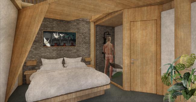两(BIM设计)间较小,但即便再小的房间功能也一应俱全。折的形式将立面与室内串联,像是一个被手工折叠过的千纸鹤座落在院落两侧。羽翼将床体包被,温暖的围护,这将是一个放生建筑,比鸟儿躺在巢穴中的还要舒适惬意。