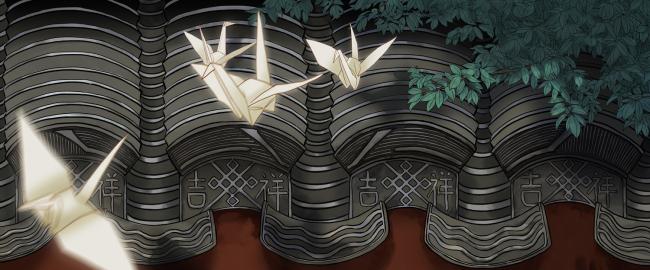 呼应建筑折叠似鸟翼的具有现代感的屋檐,画面以传统屋檐的瓦当为主体,四行瓦当瓦片和滴水在画面中连续重复,具有形式感,同时瓦当的纹路里加入了“雀折”侧视的形状,有机的融合了现代和传统屋檐 。画面中发光飞行的纸鹤成为视觉中心,替换了真实的雀鸟,一方面呼应了“雀折”的设计灵感,另一方面使画面具有故事性和灵动性,长形的画幅似“雀折”中引导人们视线的窗口,纸鹤仿佛要飞出画框,飞进屋内。