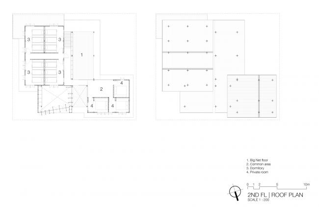 关于建筑空间的安排,我们在较大的建筑里布置了一间四床位和一件六床位的女生宿舍,在底层的尽头布置了共享卫生间/淋浴间。男生宿舍则在楼上一层,有两间三床位宿舍,一间四床位宿舍,还有一间六床位宿舍。带有工作台,储物柜和自行装饰架的床是专为这些特定的客房而设计的,配有柔软的窗帘,这样,就分隔出了一个个的隐私空间。较小的建筑包括了一层的两间私密房间和三间卧室,以及二层三间私密性更强的房间,设有休憩平台。