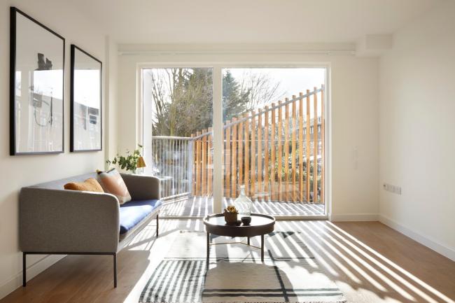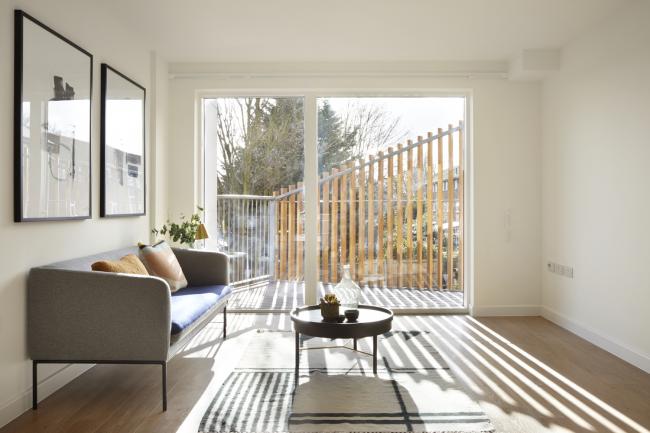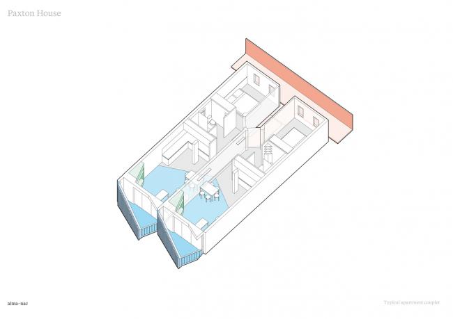 有角度的阳台,以及将入户交通从建筑中半抽离出来的设计,消灭了完全北向的户型,让 Paxton 集合住宅中的每一间公寓都能享受到充足的阳光。