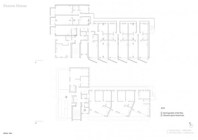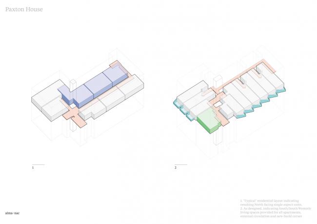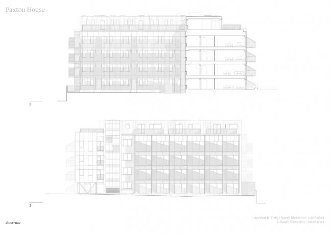 Paxton 集合住宅位于伦敦南部 Croydon 区的一个复杂场地内,该场地属于当地开放商。这里曾经是一栋混凝土框架的旧办公大楼,由于已经空置,它被“占屋者”( squatters )占据使用。而现在,该建筑已经被精心改造成为一栋极具创新性的住宅,拥有四十三间公寓和一系列公共空间。