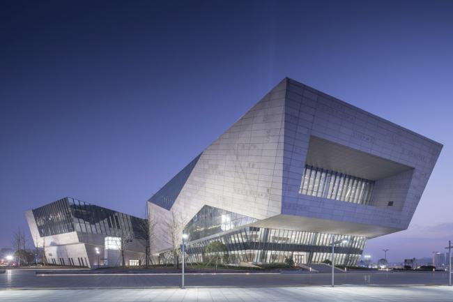 图书馆总建筑面积31322㎡。倾斜的形体形成面向江面景观跌级的阅览空间,检索大厅上空互相穿插的廊道形成戏剧化的建筑空间。图书馆外墙采用局部文字纹样1m*3m的混凝土板,文字内容摘自《荀子·劝学篇》的励志古训,彰显图书馆作为传播知识的载体特征。