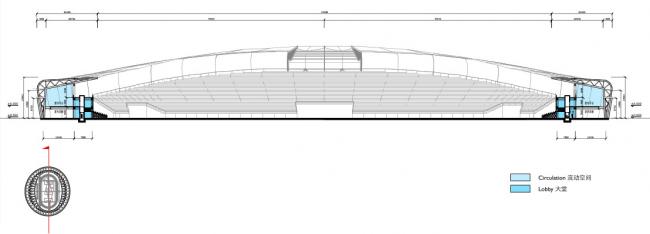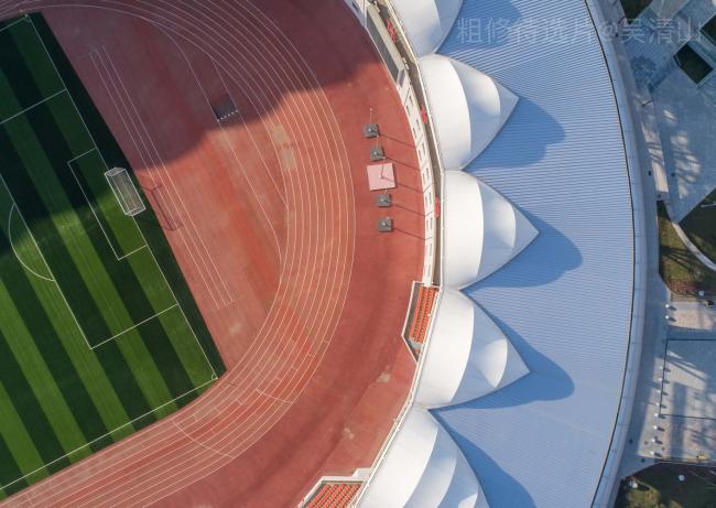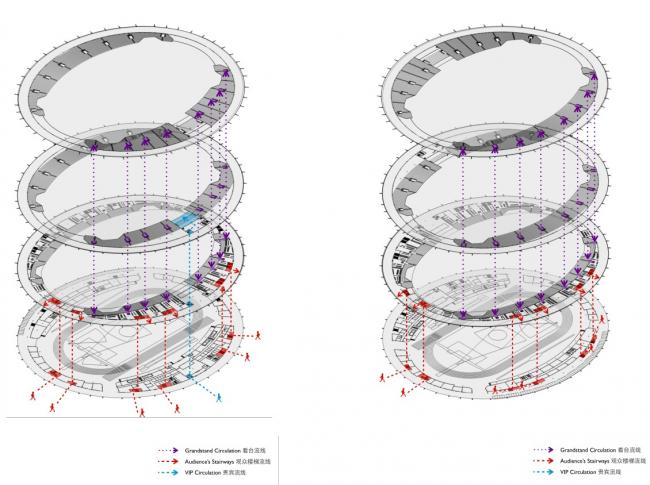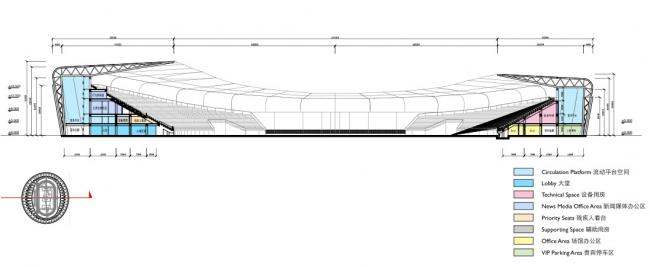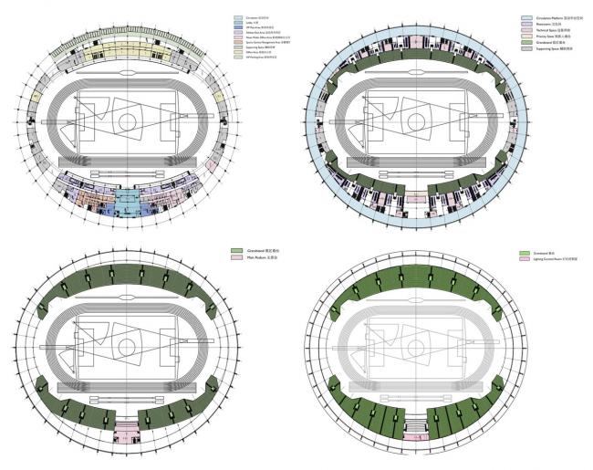 体育场观众席外轮廓采用椭圆形平面,以使视距质量较好的东、西看台可容纳更多的观众,最大限度地争取了视觉优质区内的观众数量。西看台底层平面由运动员、裁判员用房、组委会用房(BIM建筑)、记者用房、新闻中心等用房组成;西看台二层主要为观众休息平台,看台下空间设计有卫生间、服务间、设备等设施;东看台底层设有办公用房和对外开发的商业用房。主席台设在西看台中部,力图通过后退、升高的办法,使其与一般观众席脱开,以取得良好的深度感。