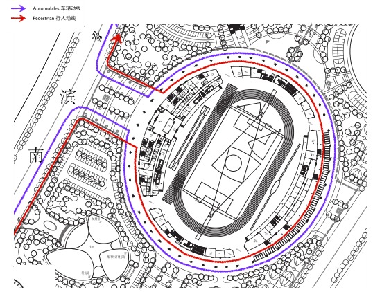 在功能上,体育场东侧设主要入口广场,东北、东南侧结合室外运动场地和停车布置集中绿地;建筑设有四个入口,主入口设在基地东侧的折双路上。观众入口有两个,分为步行入口和车行入口。西向广场的主入口为步行入口,具有一定的集散能力。东向入口设计考虑车行为主。在奥体中心南侧规划路设有贵宾、运动员和媒体记者出入口,必要时,也可作为观众紧急疏散口。基地东侧折双路和北侧龙岩南路上的开口,主要作为各项人流的紧急疏散口。