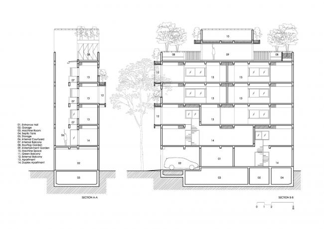 “双层”立面结合了两层,分别是作为内层砖的内层——玻璃的窗洞和外砖层外层——阳台空心砖和绿色植物。这个独有的立面为建筑提供遮阳,允许层间气流,更多的是使用生态建筑的表皮绿化,以减少热辐射,并提供放松的氛围作为福利。