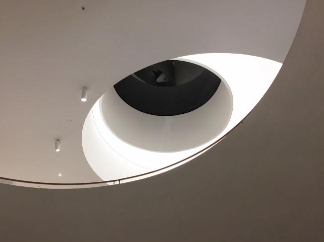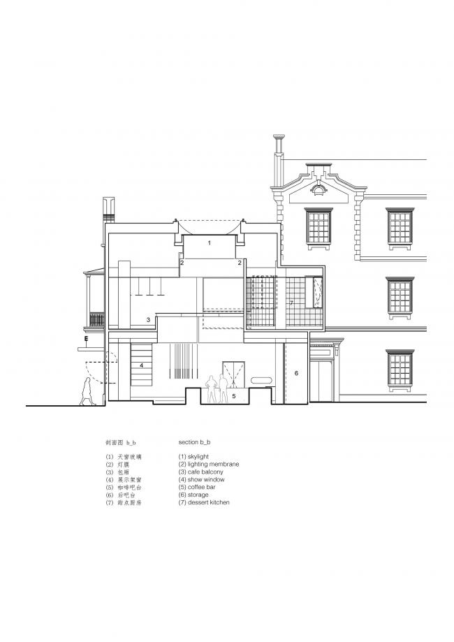 在空间上,二层楼板的中部被打通,得到一个通高的中庭空间。中庭的顶部是直径3m的天窗。天窗让阳光可以从早到晚,动态地撒入咖啡馆。