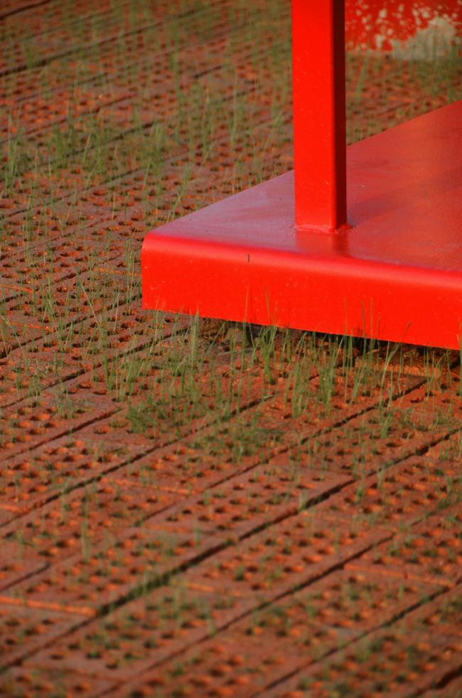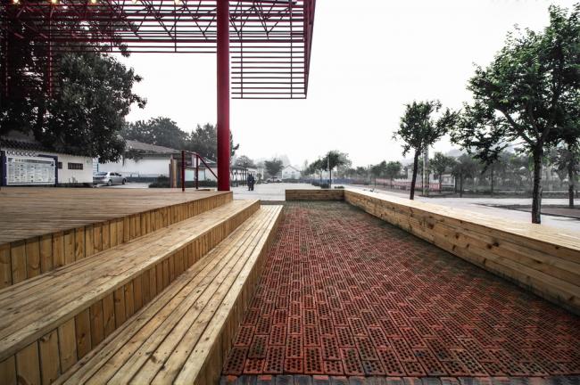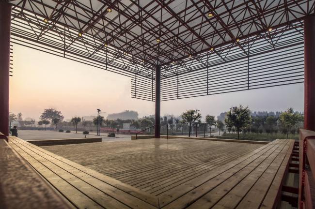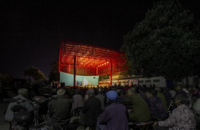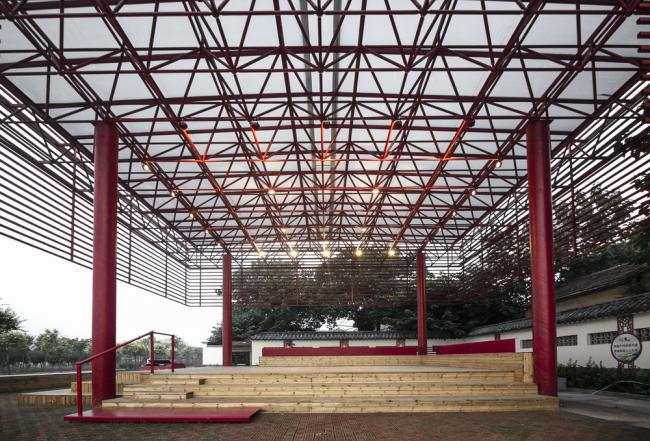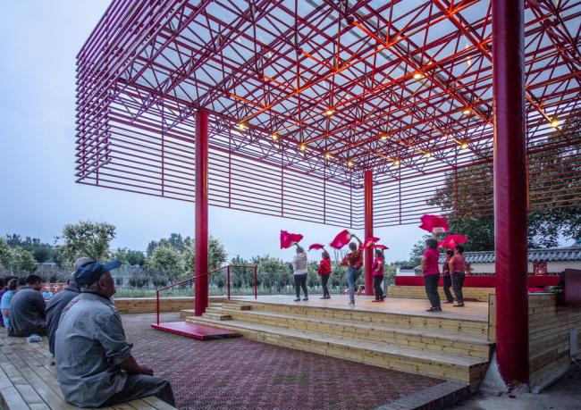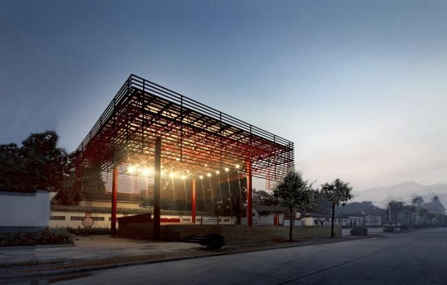 红色是中国乡村喜爱的色彩,整个屋面结构被喜庆的红色喷涂,犹如一个红灯笼,成为村子的标志性构筑。村子所在的广场同时还是一个乡村集市的场地,每当集市的时候五颜六色的货摊和熙熙攘攘的人群与这座巨大的红伞盖形成一幅奇幻而又互相映衬的乡村生活景象,同时伞盖下多功能的基座空间还可以容纳一部分集市摊位,使戏台与乡村集市融为一体。