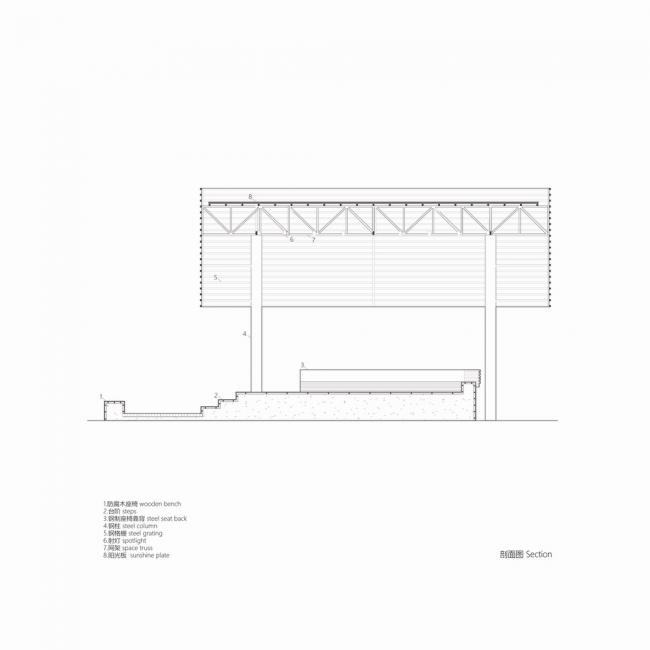 天棚之下为一个通透的开放空间,中间抬高形成视觉焦点,也便于演出等活动展开,台上两侧升起变为座椅,非演出时在台上活动的村民可以围坐聊天,舞台另外两侧向广场逐级演化为台阶,为日常活动提供休息设施。铺装延伸至广场后,边缘设置观演座椅。整个戏台以一种自由开敞和公共的姿态呈现在村庄之中,承载村民的的各种公共活动。