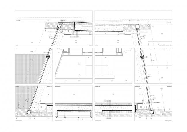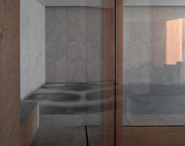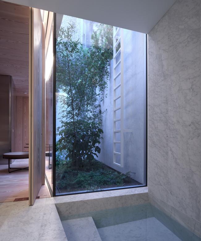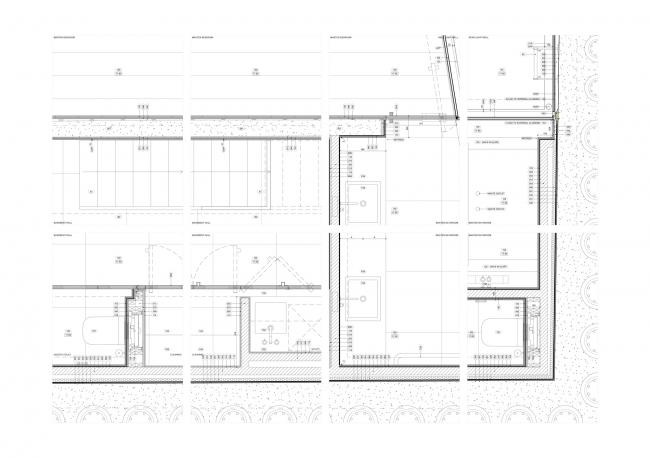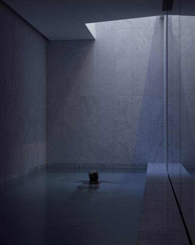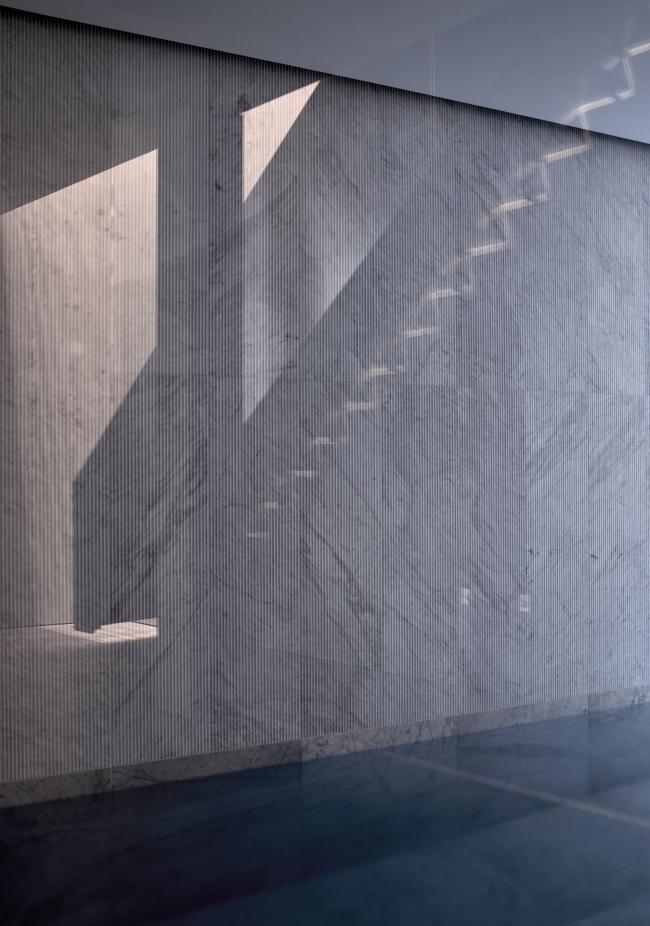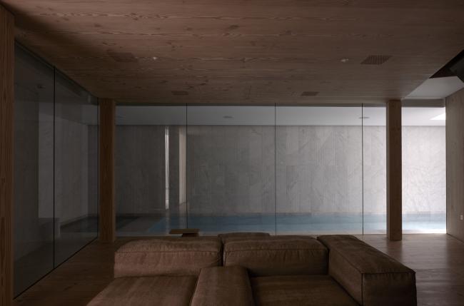 在房子的底层厨房的表面和下面的房间细节都会反复出现铜质的装饰特征,为室内增添了微妙的色调温暖。道格拉斯冷杉和雕刻的卡拉拉大理石之间冷色调和暖色调的对比增加了地下空间的视觉品质,经过仔细考察后的光暗设计也是这样的原理。地面下有两层。卧室位于第一层,而宽敞的起居和走廊区则设有一个10米长的游泳池,位于第二层。光壁和天窗设计用于优化日光的使用,投射顶灯于地板和墙壁上。