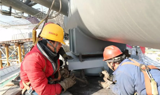 据北京城建集团国家速滑馆项目施工负责人王中录介绍,国家速滑馆屋面环桁架用钢量约8500吨,其中东西两侧滑移环桁架重5500吨,恰如钢铁“巨龙”。11月16日早上八点半开始从东、西两侧向内侧的主场馆上方平行推移,与南北侧吊装区约3000吨环桁架合为一体。