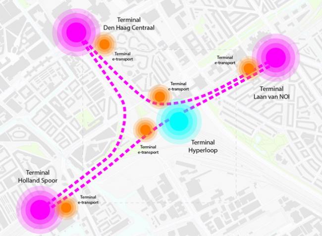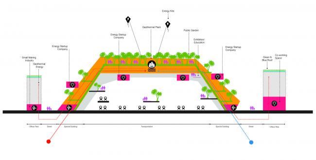 由于上层城市层覆盖现有的铁路轨道,UNStudio的城市构想中区分了许多技术“领域”,这些领域涉及我们现时的主要转型问题:能源、循环、流动性、气候适应/食水管理和粮食生产。然后将这些领域设想为“门户”:通过实际的建筑,为问题提供可行的解决方案,并作为特定主题的有趣符号,比如地热发电站作为能源转换的标志,超高速管道列车站作为流动性的标志性建筑,Biopolus水源处理厂是循环的象征。