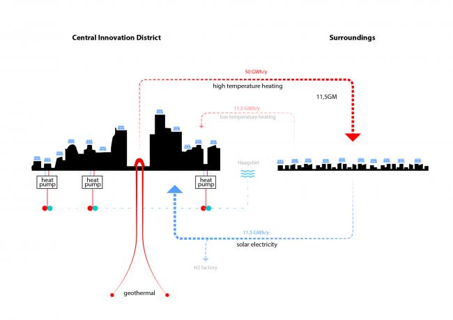 地热能源厂是能源供应的中心位置,因此是CID的重要门户。研究显示,使用热泵、冷热储存系统、最佳绝缘和太阳能板不足以完全支持这样紧凑的区域。为了使该地区实现自给自足和能源平衡,解决方案是与周边地区建立“能源交换”系统。地热能源厂从距地面2.5公里的热水库中汲取能源,并将其供应给四周的低密度地区,同时这些低密度地区将通过屋顶太阳能板产生的过剩能源输送到新的高密度建筑。