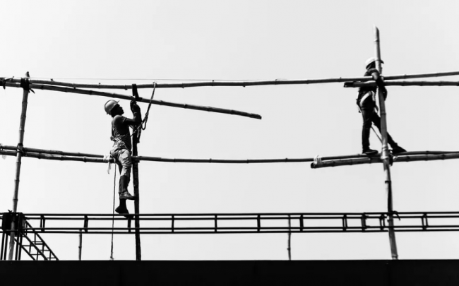(2)在屋面斜搭两块长3m、宽250mm、厚50mm的木板,将钢屋架撬至墙边上,再立起,顶部绑上溜绳,从南北两个方向拉住,此时屋架便不会倒下。
