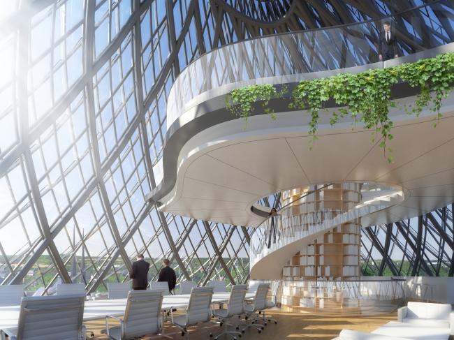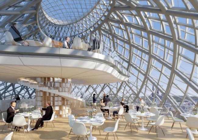 二层以上用于合作办公的空间在现有结构与新“蚕茧”形体间交替。从六楼往上,一系列包含厨房花园、屋顶平台以及餐厅的空间提供了环视整个城市的景观。