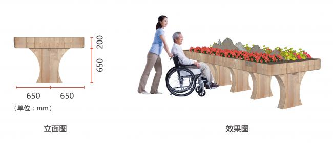 设计团队仔细研究了种植池的尺寸,保证坐轮椅的老人也能在种植池上自如的操作。种植池底部距离地面0.65m,让轮椅老人双腿刚好放入种植池底部空间;为了让坐轮椅的老人同时在种植池两侧展开园艺活动,促进老年人的交流,设计团队特意加宽了种植池的宽度。