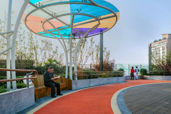 调动老人锻炼的积极性是促进老人锻炼的重要环节。在活力健身模块,设计团队通过构筑环形跑道、流线型的彩虹廊架,以趣味性和丰富的空间色彩,激发老人运动的兴趣和成就感。