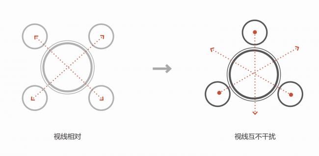 座椅采用三角形方式摆设,避免了视线的直接相撞,提高交谈的舒适度,又可看到其他区域的景观。