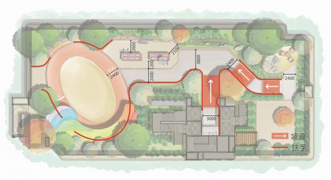 根据《无障碍设计规范》,坡道宽度≥1.80m时,能保证两辆轮椅正面相对同性。结合实践经验,康复花园所有通道宽度均≥2.40m,给轮椅自由通行的安全尺度。
