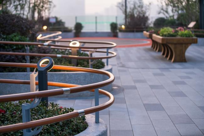 从路面与跑道的宽度、扶手设计、地面防滑材料的运用到场地倒圆角的处理与小品的固定,设计者从设计原则、整体布局到精细化细节设计为老年人的活动保驾护航。