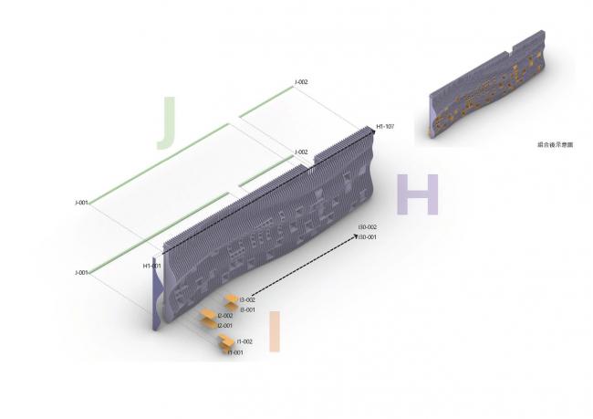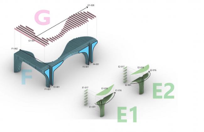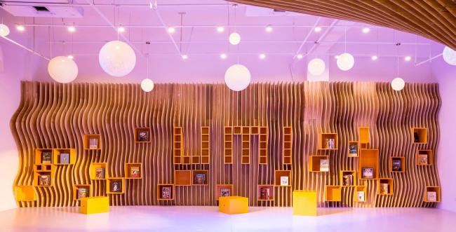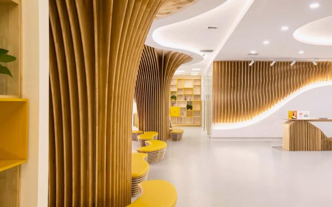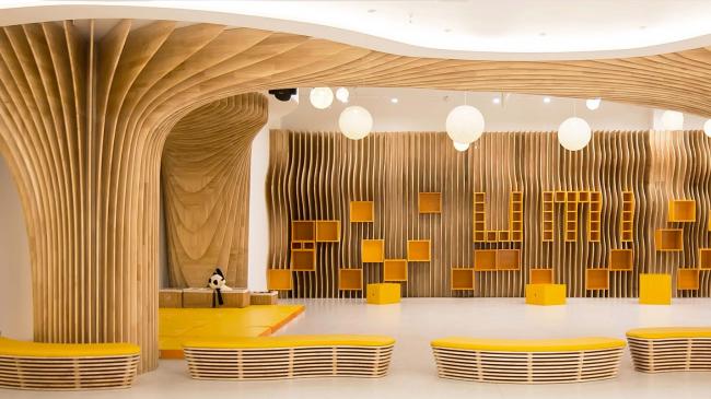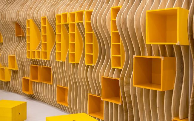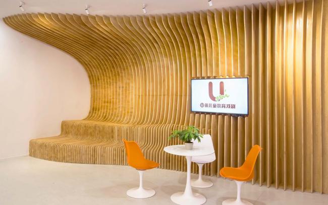 个性化的木制几何图形是通过使用单片木板的数控机床制造工艺(CNC milling)定制的。创建从数字模型到建造的标准化流程,通过一套独特的新颖图纸和技术来协调安装和施工精度。这一建造技术运用于大量的空间造型,排列出一套造型独特、视觉冲击力强的空间造型,并与之功能与人体工程学使用相对应。