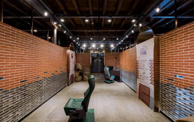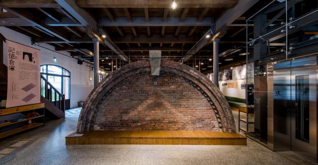 当我们坐电梯来到二楼时第一眼看到的墙面,我们把原本的旧有钢柱立在地上作为历史陈列,并运用点和钢丝网做出框架,上面悬吊着红砖,并用铁板做出圆拱门洞的形状,利用装置艺术的手法,让参观者透过这个洞看出窗户时,会看到一个隐喻三井仓库原本的位置的影像,借此告诉参观者原本三井仓库的位置与周遭环境的关系。