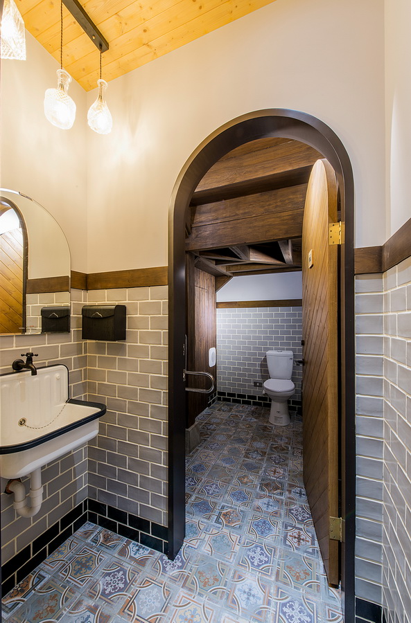 我们企图用『大正浪漫』风格来打造和洋兼容的空间氛围,因此用了许多的复古砖及花砖来做为场域的区隔,酒瓶造型的灯具、吧台的壁砖、厕所的的壁砖等等。