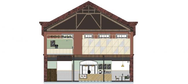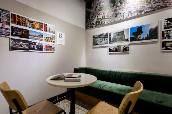 在一楼的长条座位区设定为以后的咖啡座,用的是复古绿的绒布来呈现时代氛围。