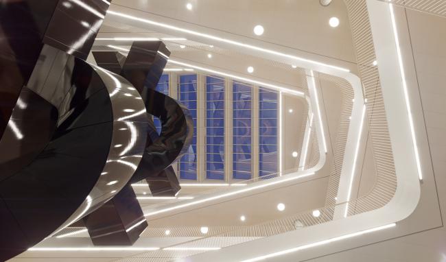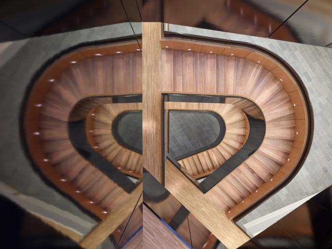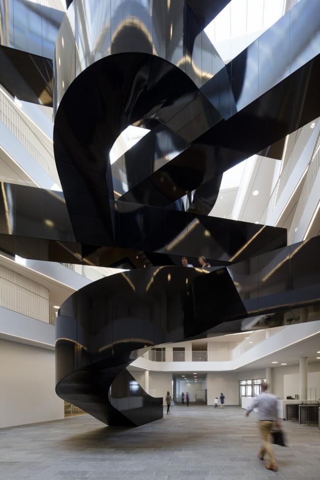 在这个星形建筑大楼的核心,是洒满日光的中庭,它起着涵盖所有共同功能的大厅层与各个楼层的办公室相连的枢纽作用,各个联合国机构与办事处都分布在这里。从中庭到中央楼梯将所有楼层联系在一起。来自3XN的设计师将这个核心楼梯打造成为了一个具有戏剧性特质的空间雕塑,这为联合国在世界各地的员工不断的创造了新的对话,互动和相遇的机会,也是一种积极向上的工作象征。