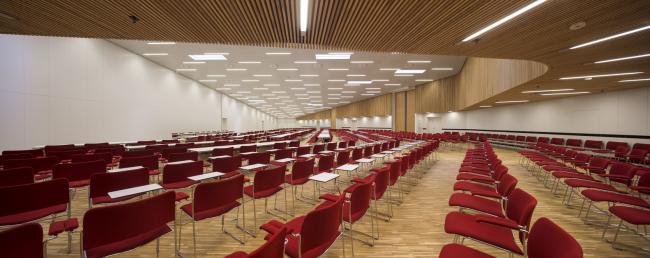 主体的办公大楼内包含有90多间会议室,每层楼都具有适合多灵活使用的房间,工作人员可以用于各种目的空间。礼堂最多可同时总纳450人共同进行会议研讨。对于较小型的会议和交谈,可以使用由专门设计的隔板分割而成的小面积房间。