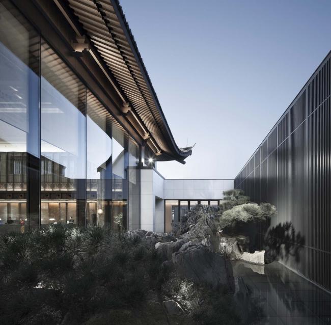 新大堂的屋面设计是将一个四坡金属建构屋顶放在一个形成了前后院落和侧开天井等传统空间序列的现代方盒子上。整个屋顶正好放置处于新的南北轴及东西向轴线交点上,形式上采用了四坡重檐的基本型制,其中下檐屋面与东南角原大堂的屋顶采用完全一致的细节,而上檐屋面,通过现代语言——钢构、玻璃、格棚等的应用,转述为一个更为现代更符合现代功能需求和精神表达的建构形象。