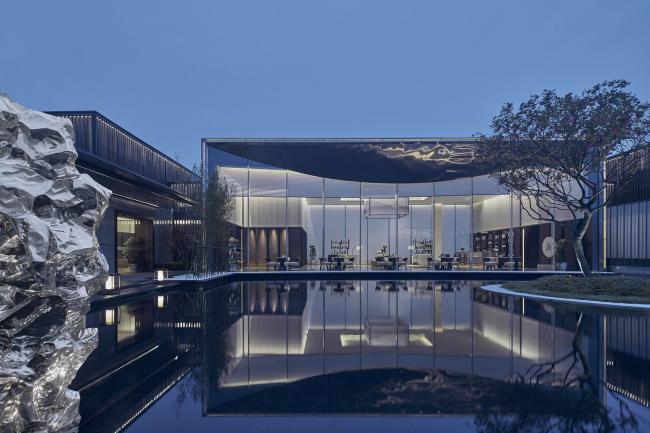 玻璃墙无框无柱,有着山岚巍峨之感,与水面相得益彰,使空间通透而秩序井然。面向湖面的弧形屋檐,采用了视觉上轻盈的不锈钢,柔美中带着坚硬的质感,行云流水,在光影下相互交叠,使空间灵动而富有诗意。